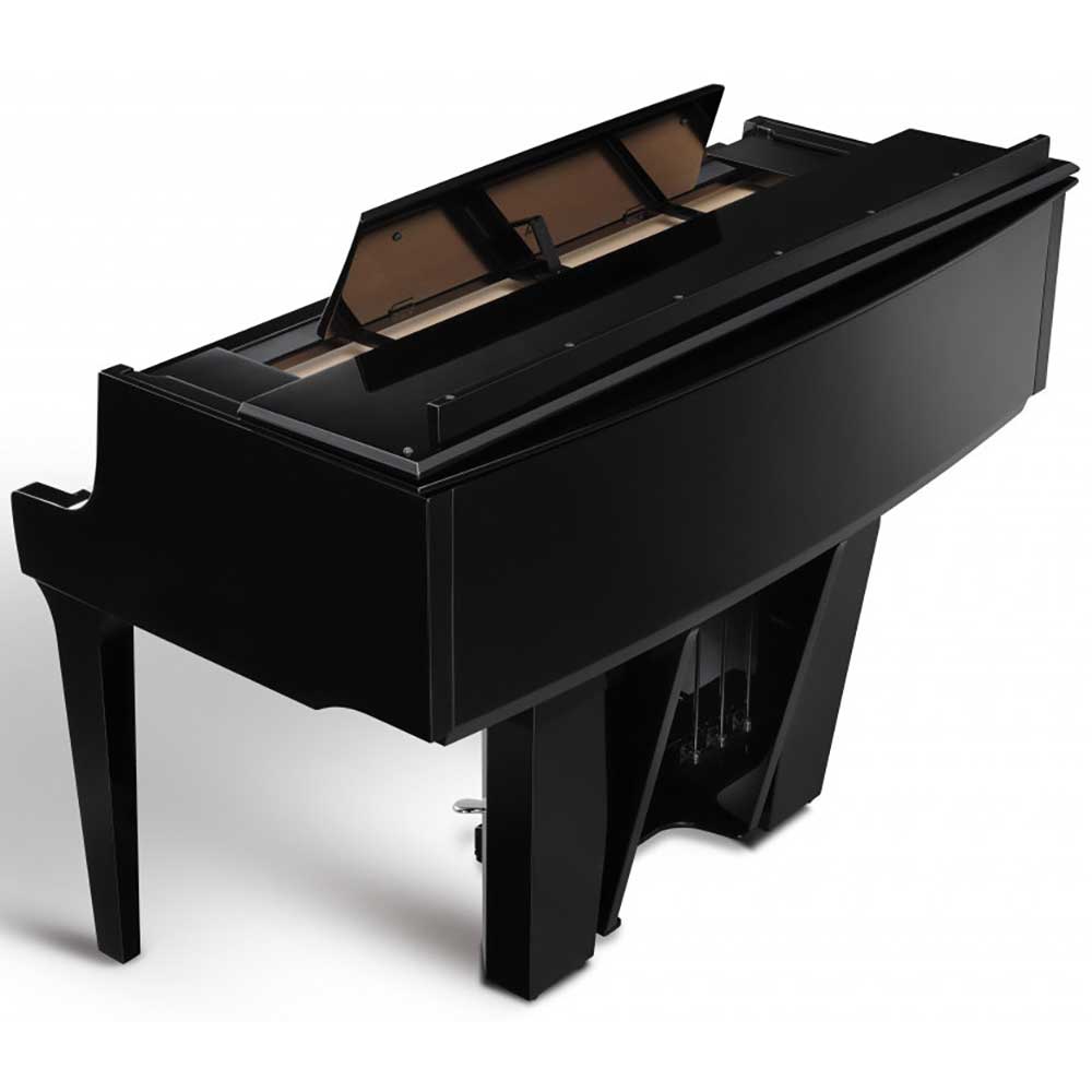 Visually, the NV12 makes an immediate impression with its redesigned cabinet that extends approximately one-third deeper than the NV10S, featuring a gently curved rear body and a three-position topboard lid – enhancing both acoustic projection and aesthetic appeal. The centre column retains the signature polished silver pedal rods, but now features an open design that gives the instrument a lighter, less bulky presence. In addition, the NV12 is the first Novus instrument to incorporate a real grand piano music shelf, allowing players to adjust the angle and position of the music rest, or remove it entirely, for greater flexibility and authenticity.