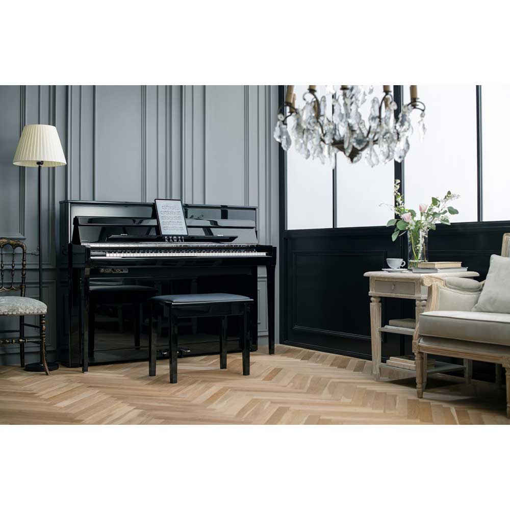 The modern acousticThe Novus NV6's stunning ebony polish cabinet is crafted in the same piano production facility as Kawai's 'K' series upright instruments, ensuring exceptional build quality and an immaculate mirror-like finish. Its exterior appearance is undoubtedly inspired by classic piano design, thanks in part to the handsome fallboard and wide music rest, providing a sense of stability and reassurance when sitting at the instrument. However, this traditional character is refined and refreshed by the NV6's gently curved edge lines, elegantly tapered legs – free of the customary, weighty toe-blocks – and various other details that lift and modernise the instrument's presence.