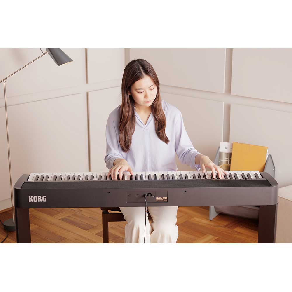 A keyboard that supports confident playingThe B2+ features Korg's Natural Weighted Hammer Action piano keyboard, oDering a smooth and satisfying feel that responds to your dynamics and technique. Just like an acoustic piano, the lower notes feel slightly heavier and the upper notes lighter, helping you to build finger strength and control as you play. With three levels of touch sensitivity to choose from, the keyboard can be tailored to match your playing style - whether you're looking for a lighter response or more resistance under your fingers.